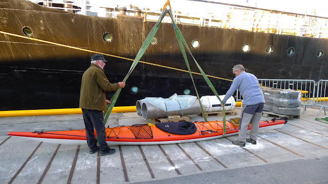 Neste ettermiddag i Brønnøysund. Lang transport og bæring til flytebrygga. Her er vi etter hvert klare for første økta.